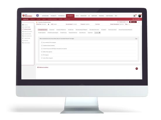 - Incident Info: Document general incident details, incident types, actions and tactics, location (including polygon mapping), involved entities, custom fields, and incident narratives.
